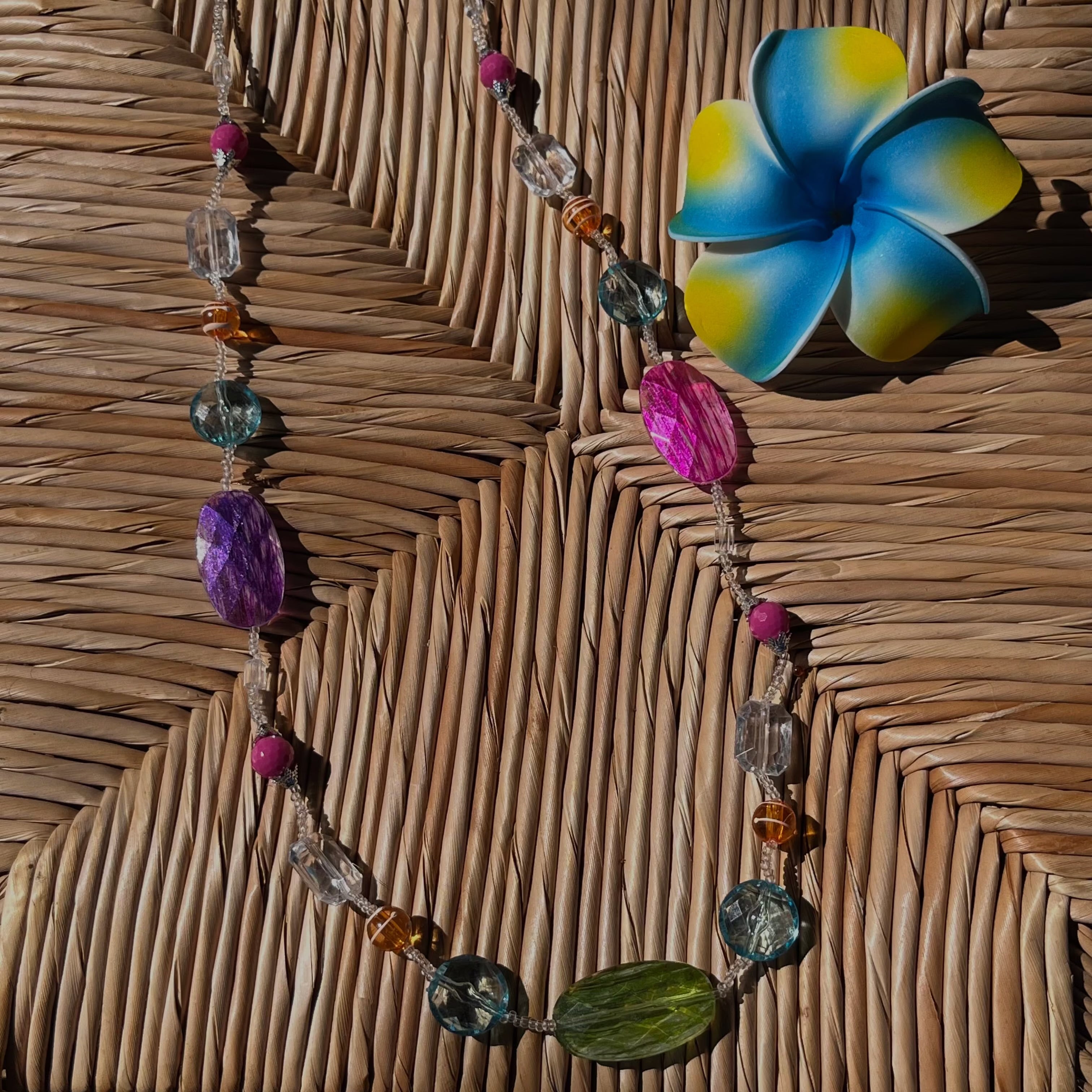 Step into a daydream with this necklace; a whimsical relic straight out of an early-2000s fantasy. Handcrafted with shimmering beads in shades of purple, pink, blue, orange, clear, and green, this vintage treasure captures the soft sparkle of sunlight hitting a secret cove — every bead feels like it was borrowed from a mermaid’s vanity or a fairy’s jewelry box.